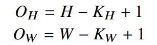 - 입력크기를 $(H, W)$, 커널크기를 $(K_H, K_W)$,출력크기를 $(O_H, O_W)$라 하면, 출력크기는 다음과 같이 계산