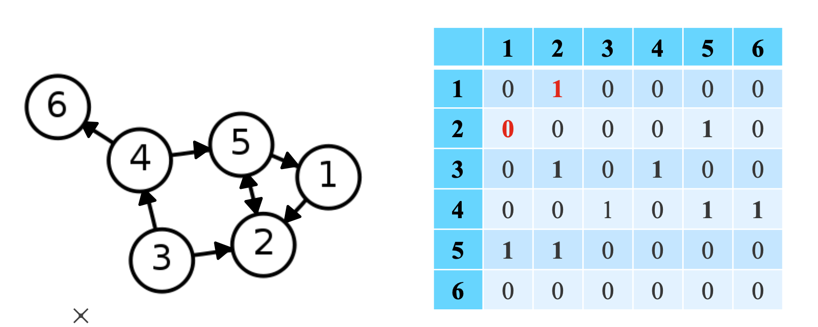 - 정점 𝑖에서 𝑗로의 간선이 있는 경우, 행렬의 𝑖행 𝑗열 원소가 1