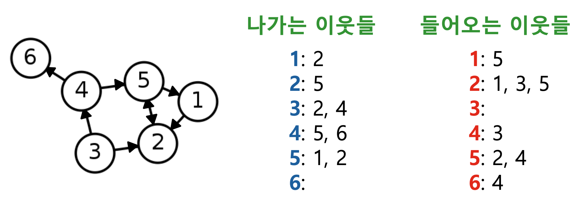 - 방향성이 있는 경우, 나가는 이웃들과 들어오는 이웃들을 각각 리스트로 저장할 수 있다.