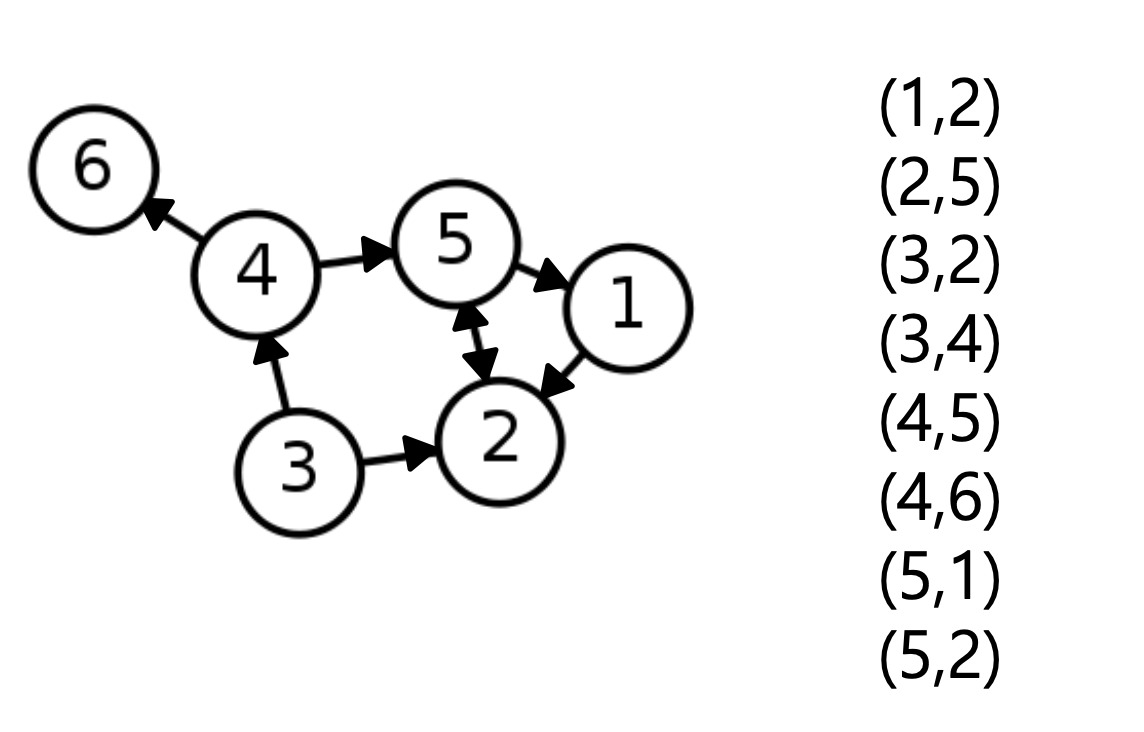 - 각 간선은 해당 간선이 연결하는 두 정점들의 순서쌍(Pair)으로 저장