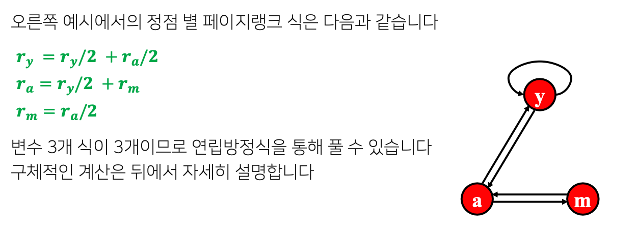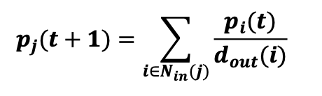 - 각 웹페이지의 페이지랭크 점수는 (이웃들에 의해) 받은 투표의 가중치 합으로 정의된다.