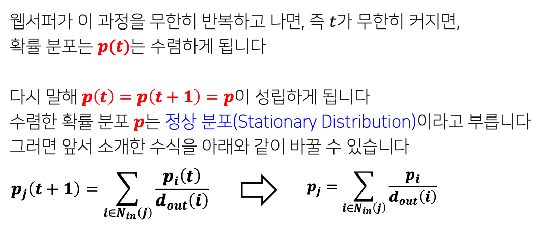 그러면 𝒑(𝒕)는 길이가 웹페이지 수와 같은 확률분포 벡터가 된다. 그러면 아래 식이 성립한다.