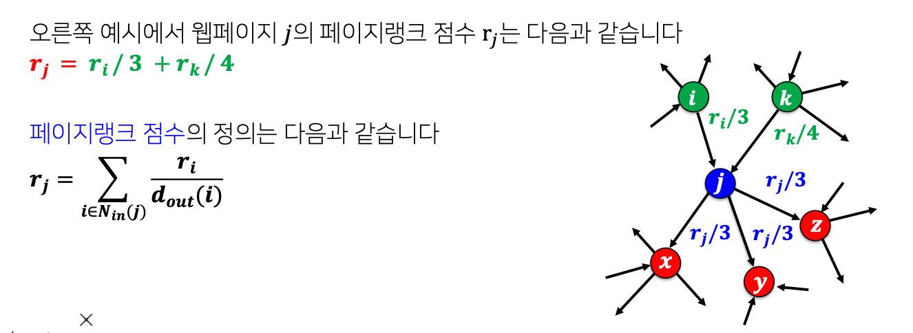 - 각 웹페이지의 페이지랭크 점수는 (이웃들에 의해) 받은 투표의 가중치 합으로 정의된다.
