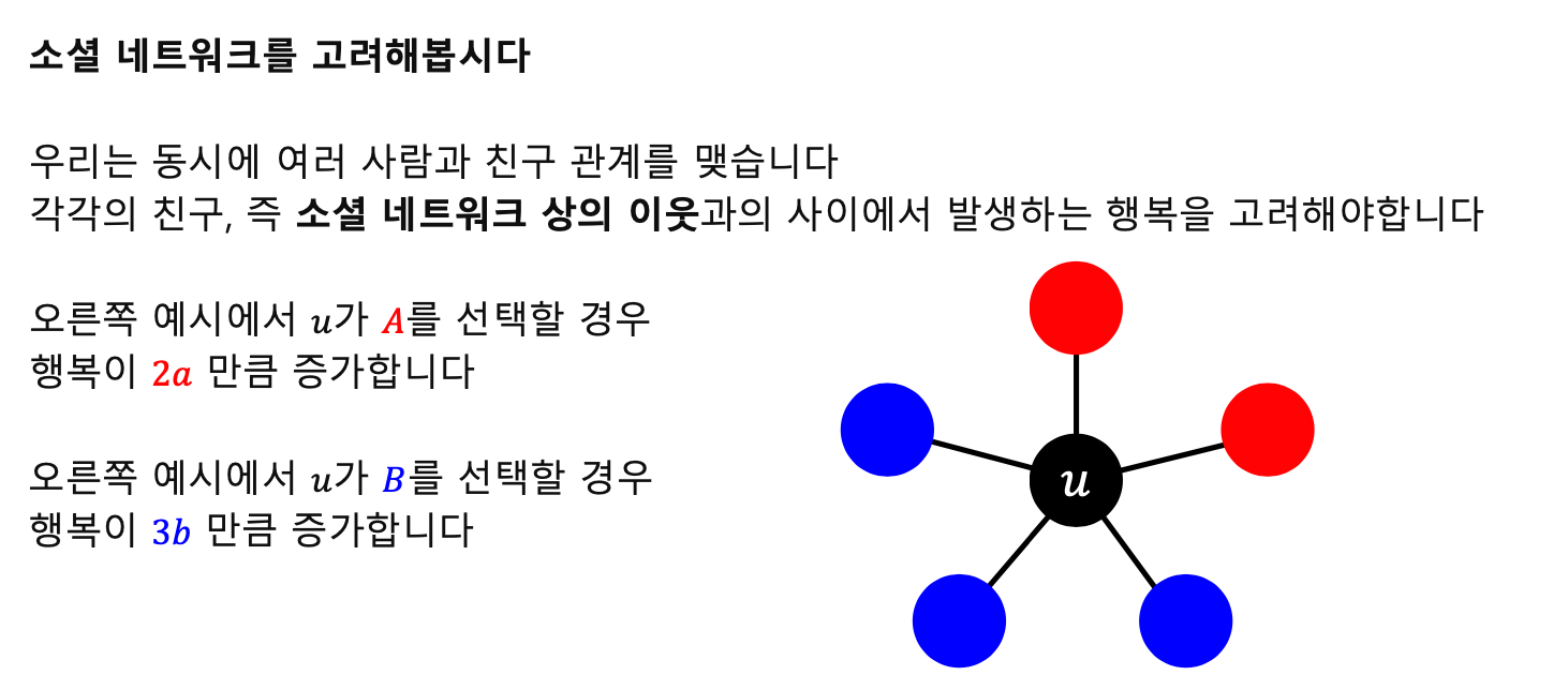 - 주변 사람들의 의사결정을 고려하여 각자 의사결정을 내리는 경우에 의사결정 기반의 전파 모형을 사용한다.