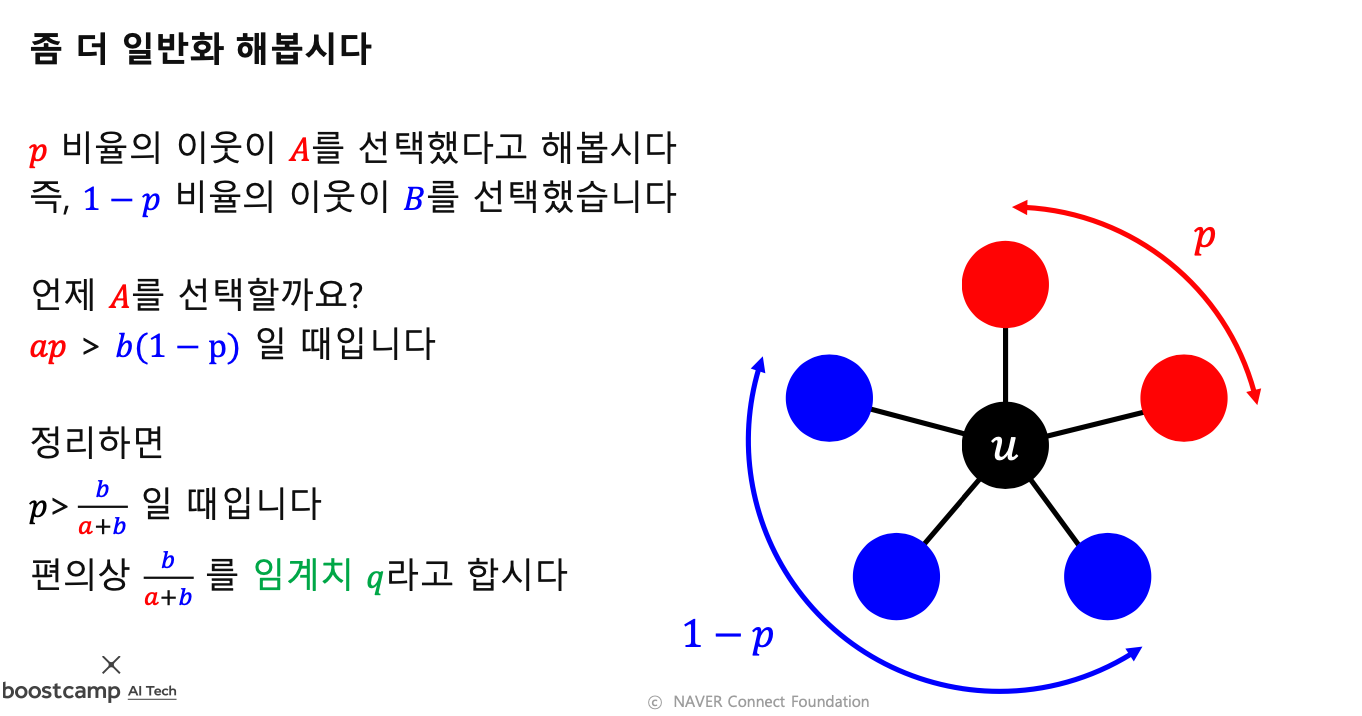 - 각 정점은 이웃 중 𝐴를 선택한 비율이 임계치 𝑞를 넘을 때만 𝐴를 선택한다.