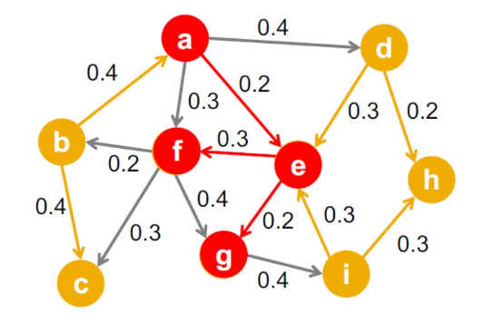 - 각 간선 (𝑢,𝑣)의 가중치 𝑝𝑢𝑣는 𝑢가 감염되었을 때 (그리고 𝑣가 감염되지 않았을 때) 𝑢가 𝑣를 감염시킬 확률에 해당한다.