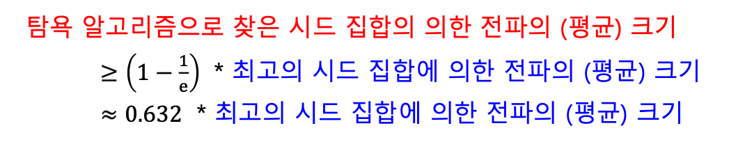 - 탐욕 알고리즘은 시드 집합의 원소, 즉 최초 전파자를 한번에 한 명씩 선택한다.