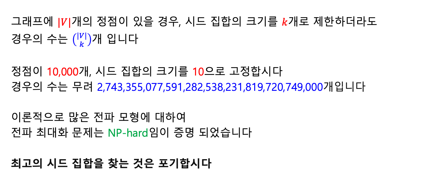 - 어떤 시드집합(수 외에도 어떤 정점을 고르느냐 또한 중요)인지가 전파 크기에 많은 영향을 미친다.