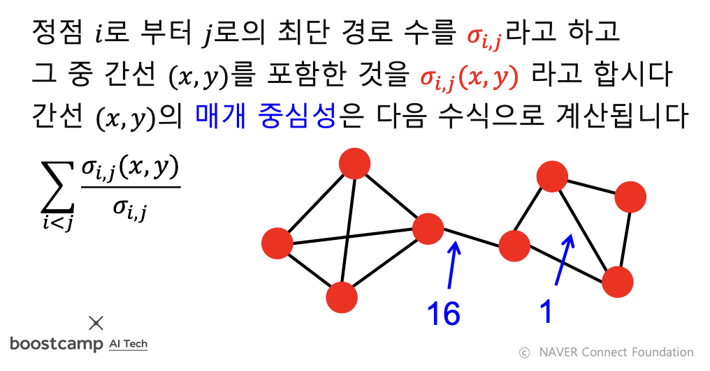 - 식: 두 정점 사이의 최단경로가 여러개 있을 때에는, 그 최단경로 중에, 매개중심성을 측정하고 있는 간선을 포함하는 것의 비율을 계산해서 그것을 모든 순서쌍에 대해 더해주는 것