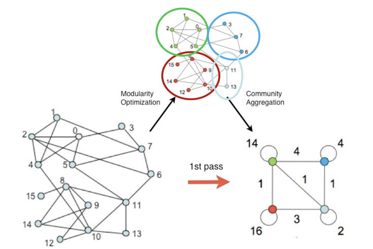 - Louvain 알고리즘은 개별 정점으로 구성된 크기 1의 군집들로부터 시작