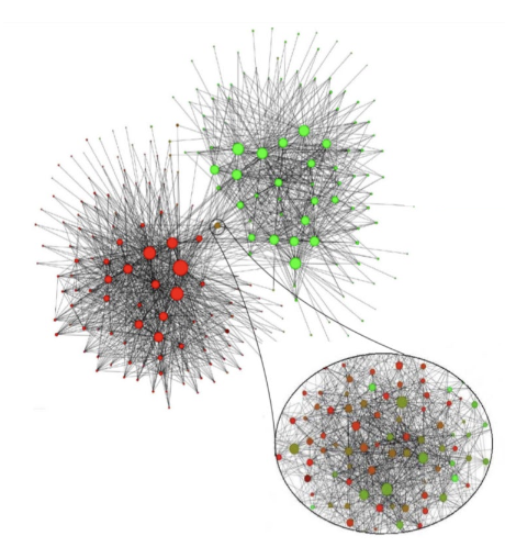 다리역할을 하는 부분(다리역할을 하는 군집으로도 표현가능)은 혼합된 정점의 분류를 보여준다.